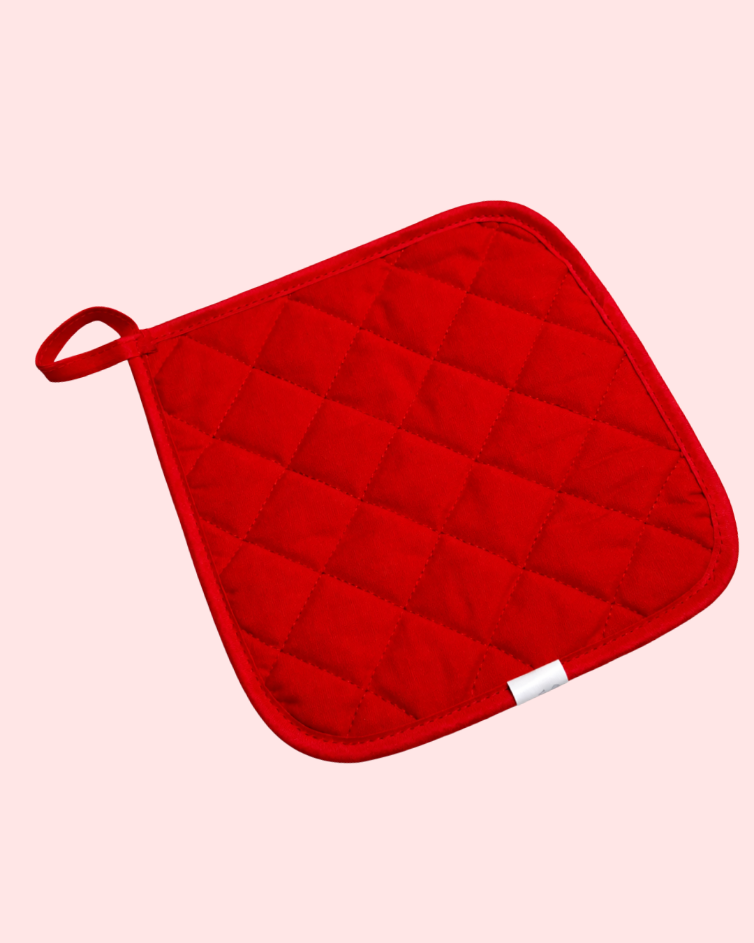 La frase "Presina per il culo" è stampata su tessuto. La presina davanti è liscia e dietro è trapuntata.